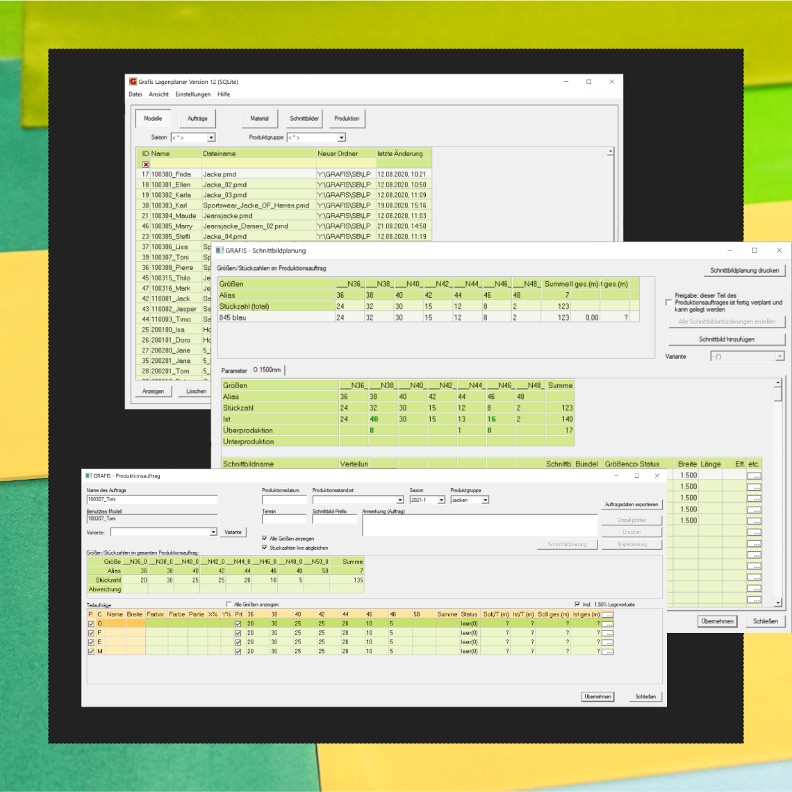 Auch die Beeinflussung der Gradierung durch stützgrößenabhängige Einstellungen einzelner Punkte ist möglich. Da GRAFIS CAD mit einer Vererbung arbeitet, werden automatisch Abhängigkeiten zwischen den Teilen hergestellt. Eine Veränderung des Entwicklungsteils führt nach Neuberechnen aller Teile direkt zu einer Anpassung der abhängigen Schnittteile. Diese Abhängigkeit bewirkt eine effektive und schnelle Erstellung von Modellvarianten.