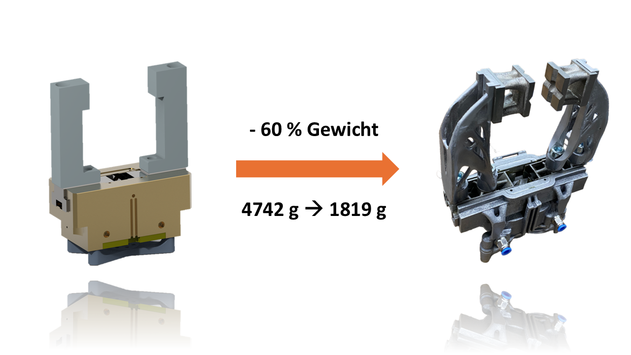 The design for AM is shown using the example of a gripper, which achieved a weight reduction of 60%.
