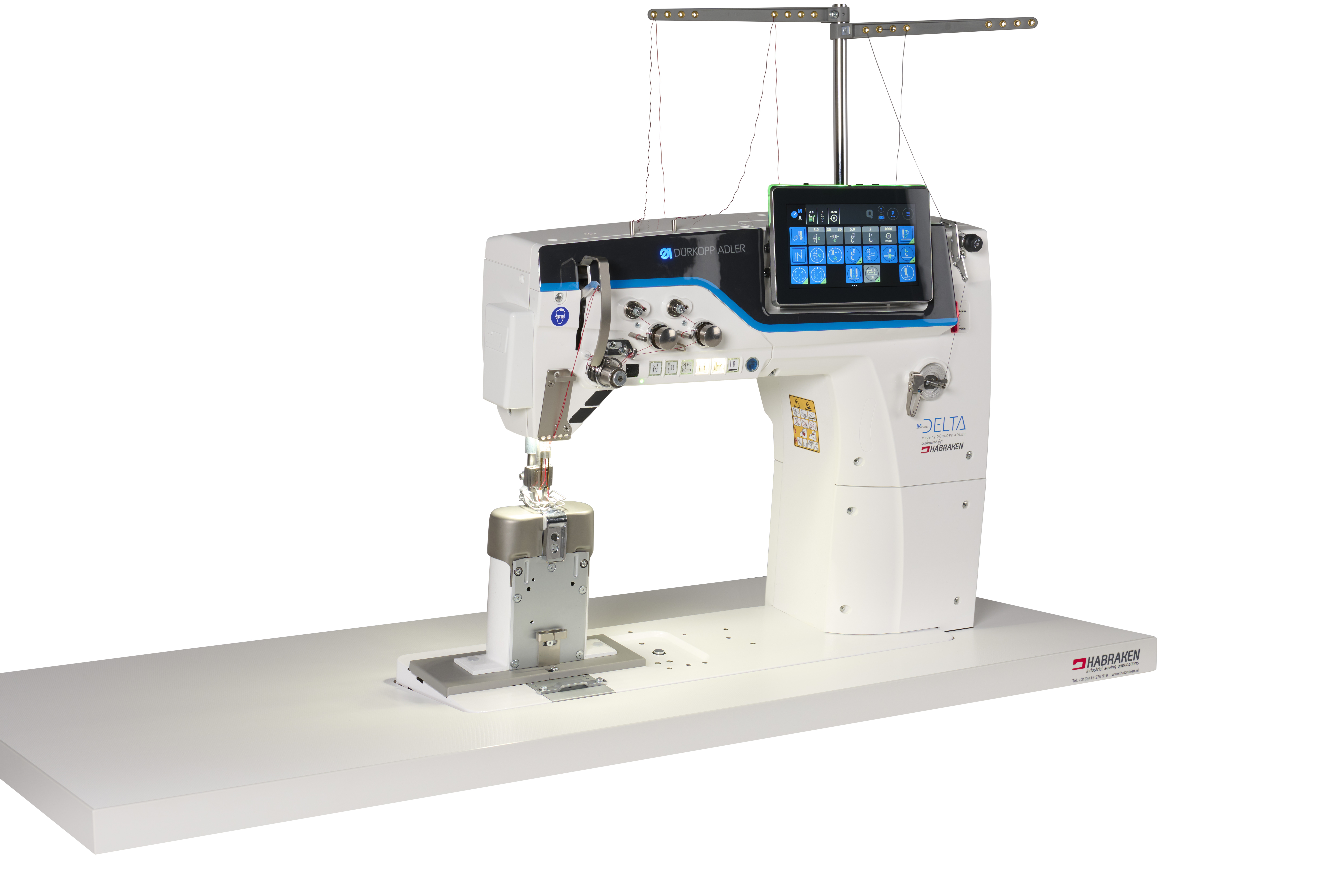 Documented sewing workstation based on a customized Dürkopp Adler M-Type sewing head and equipped with state-of-the-art monitoring devices. The HM814 combines all the benefits of an M-type triple transport or roller feed machine with tailor-made technology from Habraken.